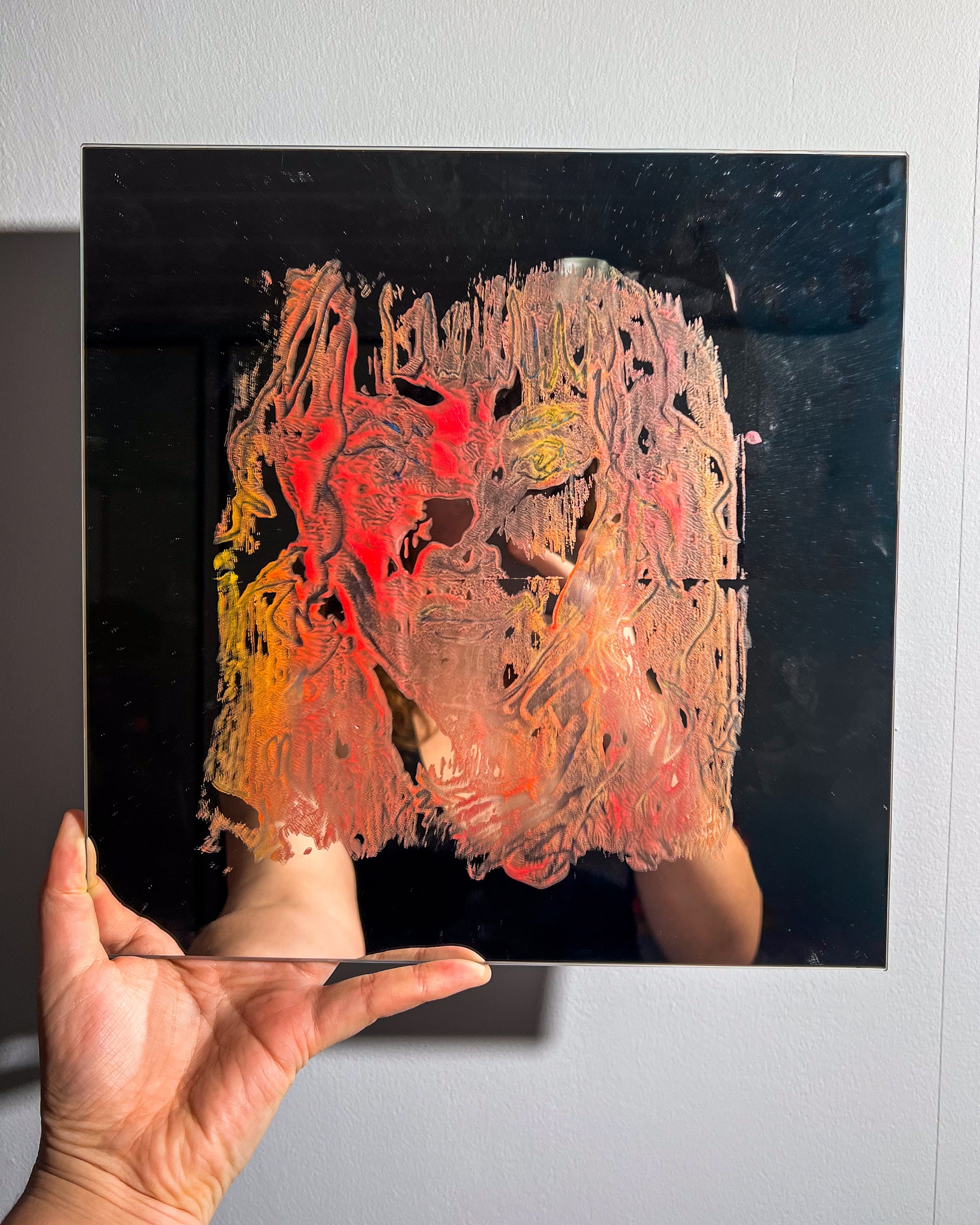 Monoprint ombre self portrait on mirror.