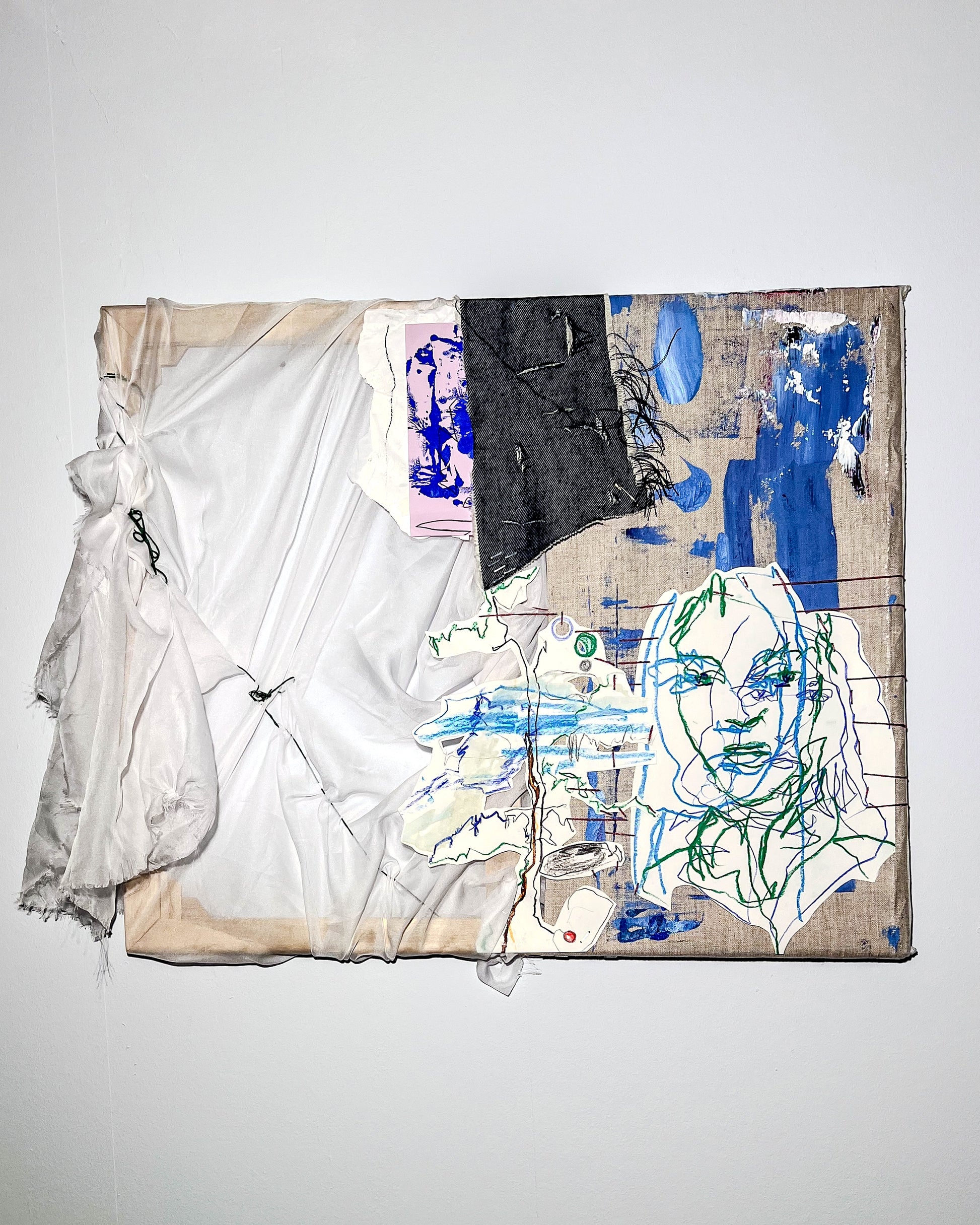 Acrylic painting with collaged elements and hand embroidery finishing.